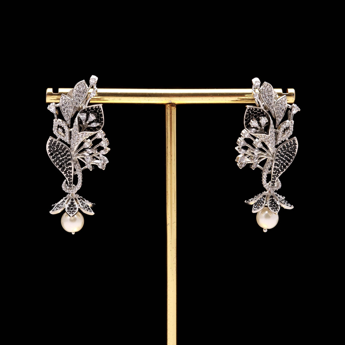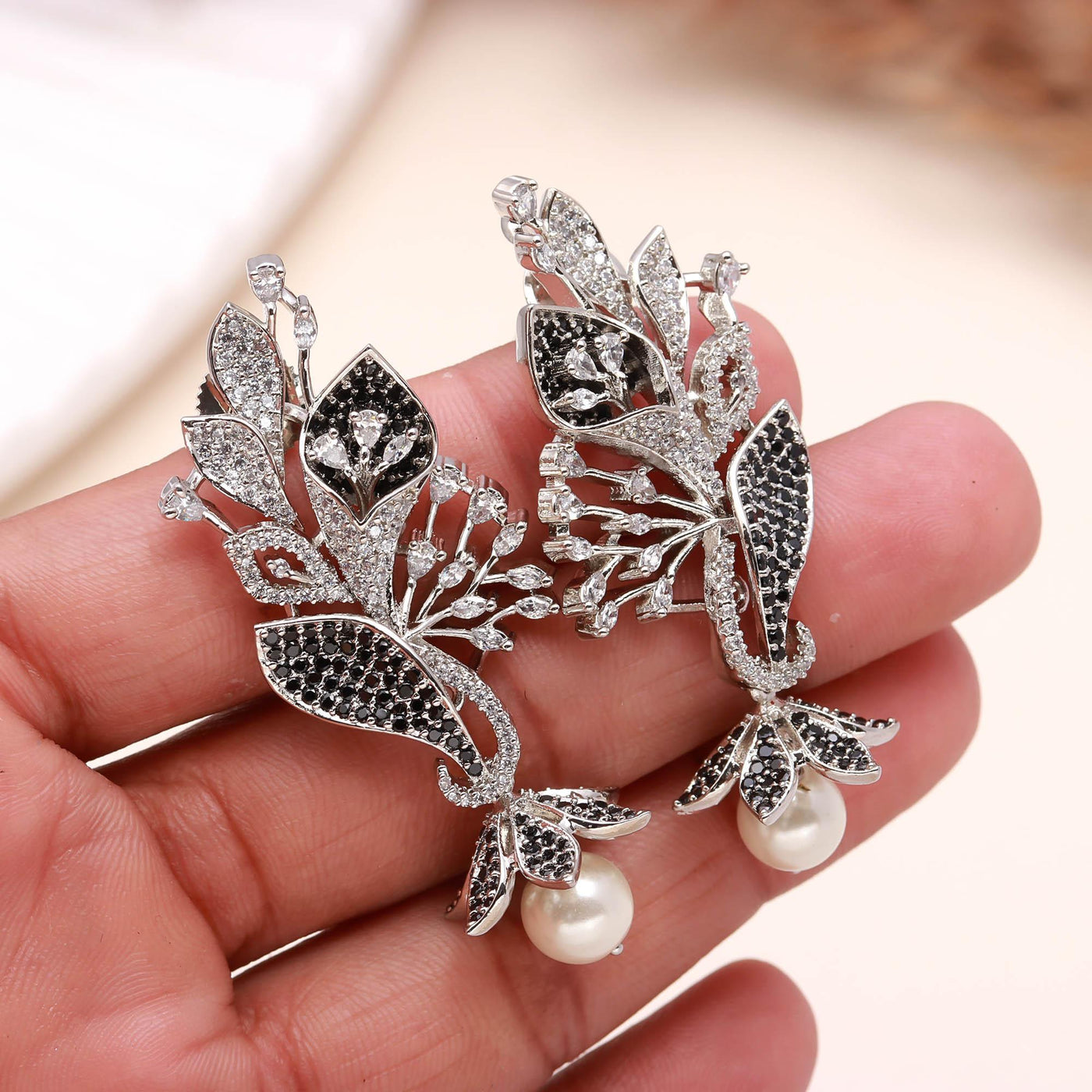 Luxury Black and White American Diamond (AD) Floral Pearl Dangler Earrings
