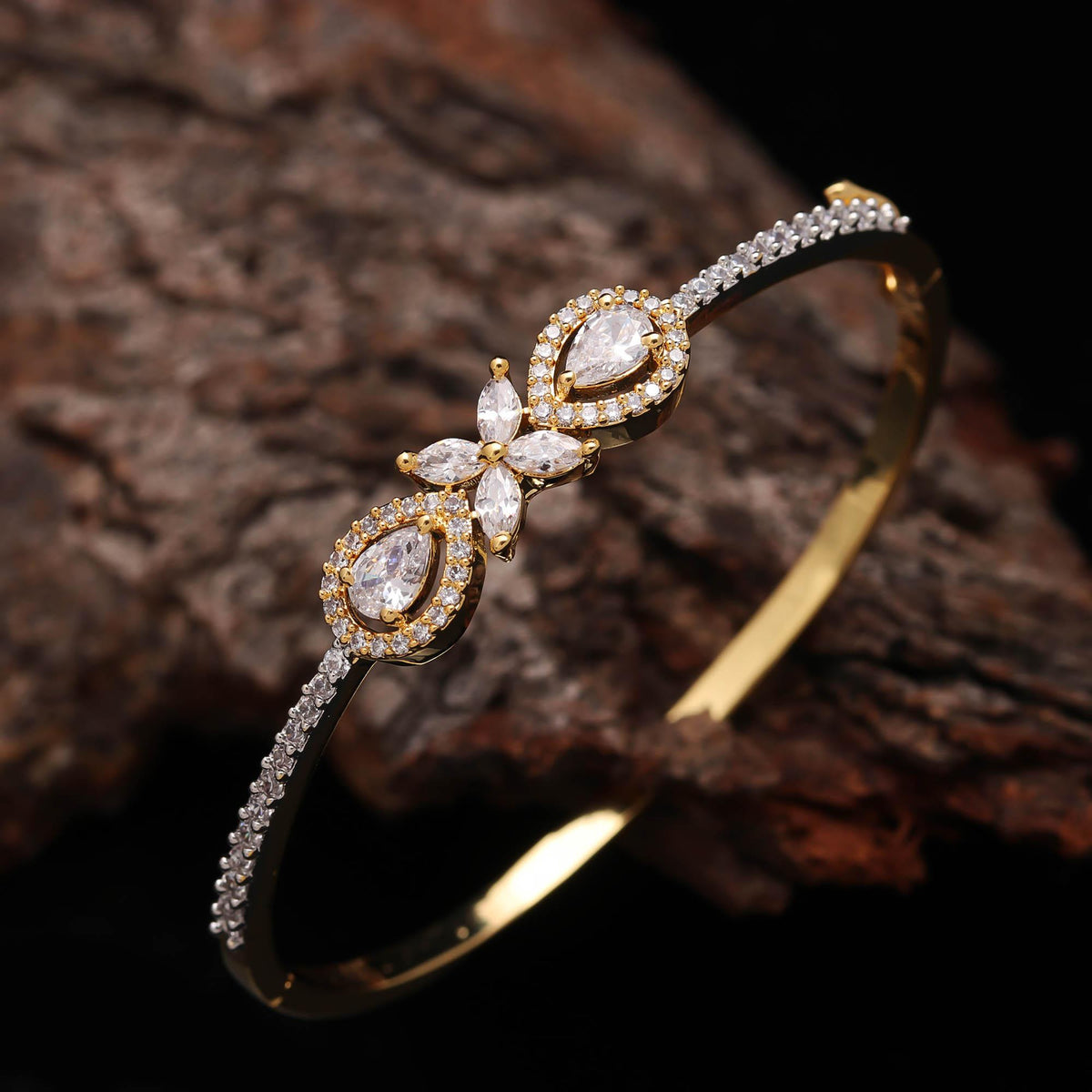Travel back in time with the breathtaking Mughal Bloom. This Indian Bracelet is rich with heritage, showcasing exquisite floral and vine patterns characteristic of Mughal artistry, meticulously carved into the gold-plated surface. Vibrant clusters of American Diamonds are set into the "blossoms," adding dazzling texture. This intricate Ethnic Jewellery piece comes with a modern safeguard: our robust Anti-Tarnish Coating ensures the deep detailing and luxurious finish remain untouched by time or climate.