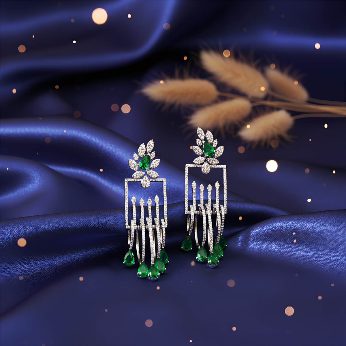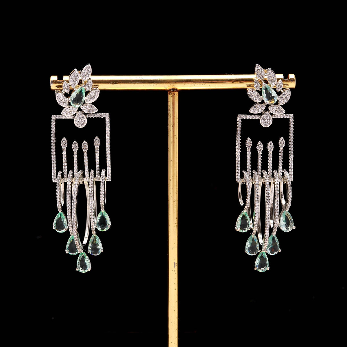 Each earring features a stunning rectangular diamond frame, delicately embellished with micro-paved cubic zirconia stones that sparkle from every angle. The design gracefully transitions into elegant teardrop-shaped emerald green crystals, creating a breathtaking contrast between shimmering silver tones and deep emerald hues. The floral-inspired top stud, adorned with a central green stone surrounded by dazzling diamonds, adds a touch of regality that makes these earrings ideal for any grand occasion.